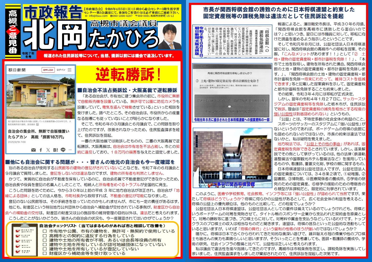 FacebookX ★最近の情報はブログやツイッターを ★最近の情報はブログやツイッターを 平成5年4月1日に行った市政報告のうち、宗教等に関するものを、一部修正してお話ししました。 ・高槻市バス民営化検討の非公開 ・採用試験の過去問を非公開 ・債権管理簿の非公開 ・事務処理ミスの非公表 ・急死児童のマスク着用を非公表 の5つのテーマでお話ししています。 なぜ、4年で質問回数30回未満が目安になるのか?同じ政党・会派でも、質問回数に極端な差が・・・いったいその理由は?この約4年間の高槻市議会での各議員の本会議・常任委員会での質問回数を集計した「市議会議員の通信簿」のポイントを解説しています。 ★黄色いカウボーイハットをかぶる理由 ★「高槻ご意見番」は、高槻市政が公正に行われるよう、情報公開制度などを通じて行政をチェックし、改革案・改善案を考え提案していくことを目的とした団体です。代表は北岡隆浩(高槻市議会議員)です。皆さんからの情報をお待ちしております。 FacebookX